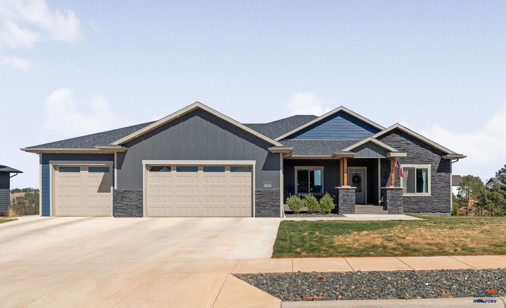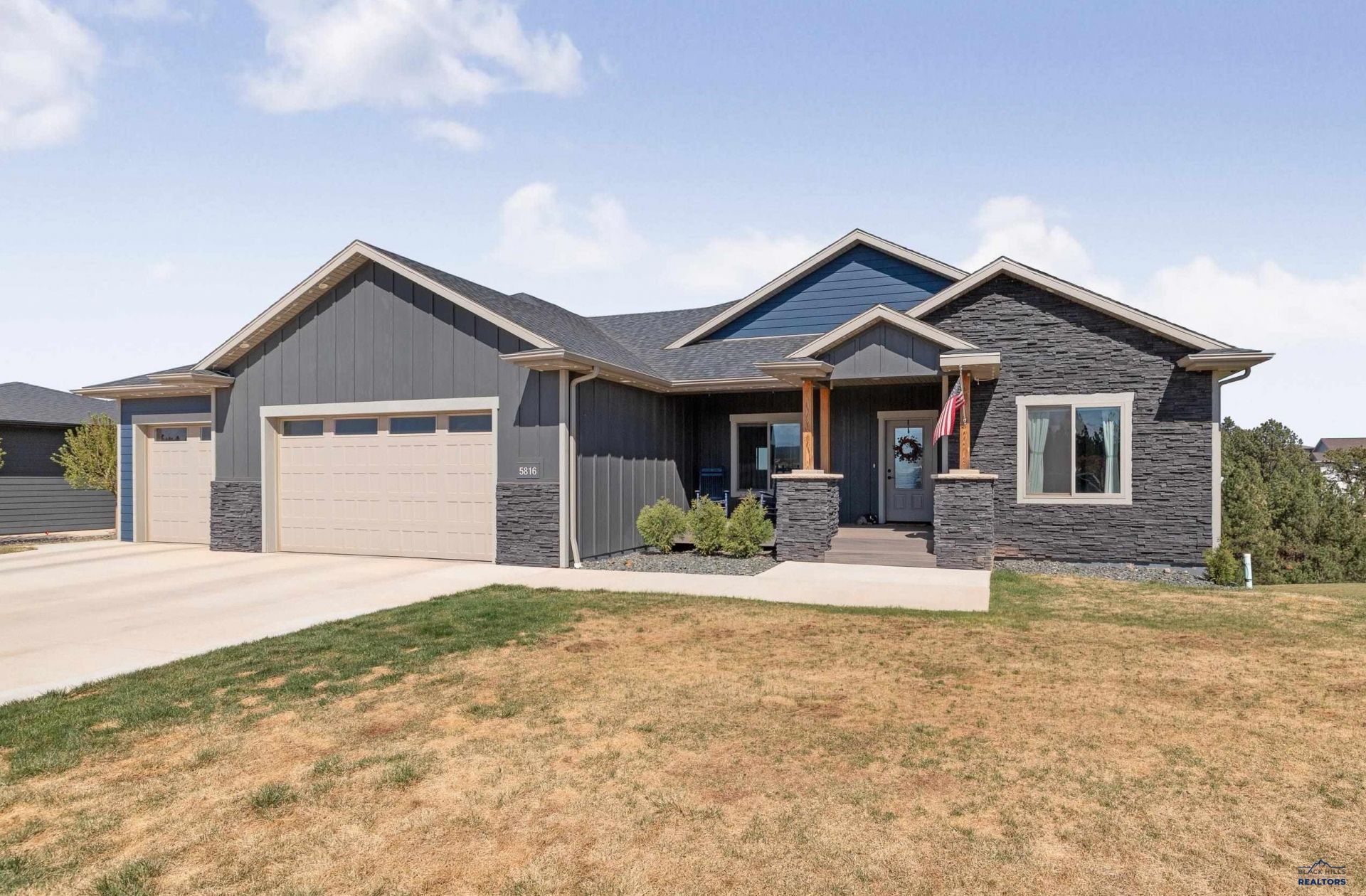 Listed by Marisa Wollman, Oak & Key Realty, 605-230-0016. Welcome to this exceptional custom-built ranch-style home in the highly sought-after Highpointe Ranch neighborhood of southwest Rapid City, just minutes from Red Rocks Golf Course. Situated on a spacious 1/2 acre lot, this must-see property offers the perfect blend of luxury, comfort, and Black Hills beauty. Featuring 5 bedrooms, 3 bathrooms, and an impressive 4-car garage, the home showcases an open-concept design with breathtaking 180-degree views from the dining room and expansive windows which carry into the family room, anchored by a stunning 12' high stone gas fireplace. The kitchen is beautifully finished with stainless steel appliances, quartz surfaces throughout and under-cabinet lighting-ideal for both everyday living and entertaining. Thoughtful craftsmanship is evident throughout, with abundant storage including an expansive laundry and mud room, large walk-in closets, extensive cabinetry with quartz surfaces, and built-ins. The primary suite offers private access to the covered deck, along with a spacious walk-in closet and a luxurious bath featuring dual vanities, a soaker tub, and a custom tile shower. The walkout basement includes oversized bedrooms and versatile spaces perfect for a theater room, hobbies, gatherings, or exercising. Enjoy outdoor living with a covered deck above and a private patio with hot tub below. The oversized garage easily accommodates a boat and three additional large vehicles. This one-of-a-kind home combines high-end finishes, incredible views, and functional design-schedule your showing today!